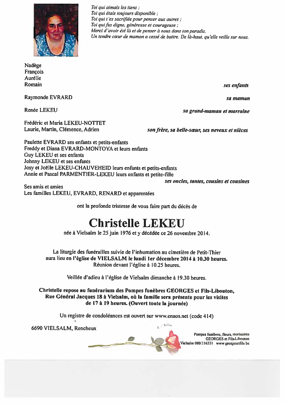 Décédée à Vielsalm (6690) le mercredi 26 novembre 2014 à l'âge de 38 ans