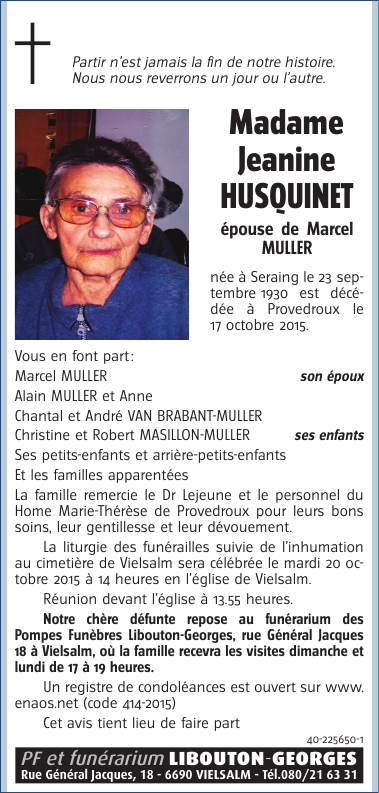 Décédée à Provedroux (6690) le samedi 17 octobre 2015 à l'âge de 85 ans