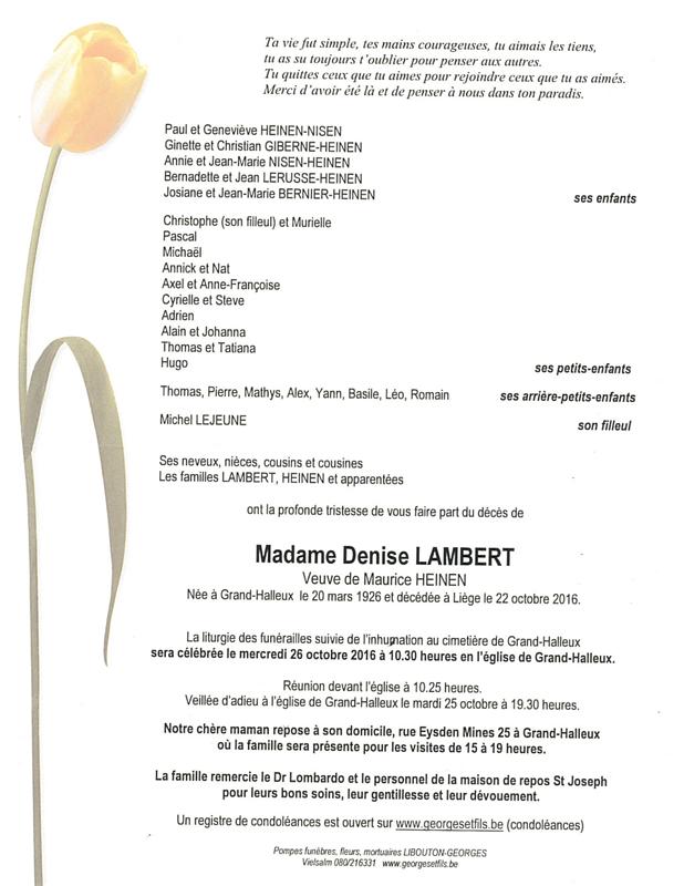 Madame Denise LAMBERT veuve de Maurice HEINEN