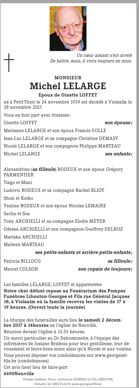 Décédé à Neuville (6690) le mardi 28 novembre 2017 à l'âge de 78 ans