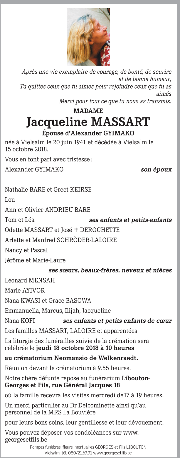 Décédée à Vielsalm (6690) le lundi 15 octobre 2018 à l'âge de 77 ans