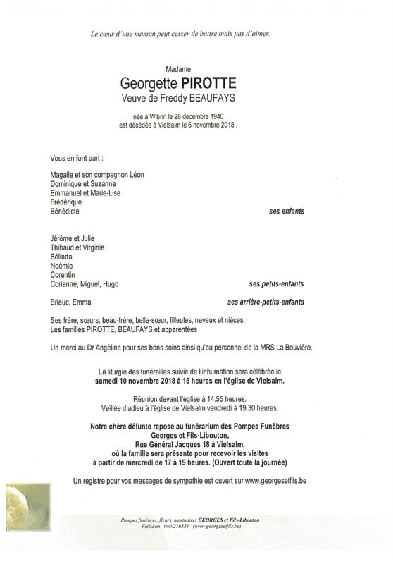Décédée à Vielsalm (6690) le mardi 6 novembre 2018 à l'âge de 77 ans