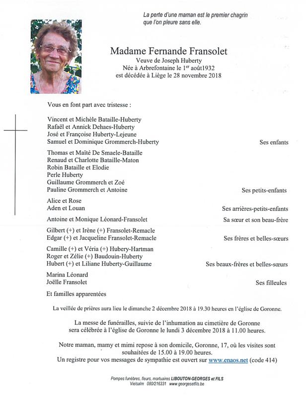 Décédée à Liège (4000) le mercredi 28 novembre 2018 à l'âge de 86 ans