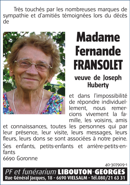 Décédée à Liège (4000) le mercredi 28 novembre 2018 à l'âge de 86 ans