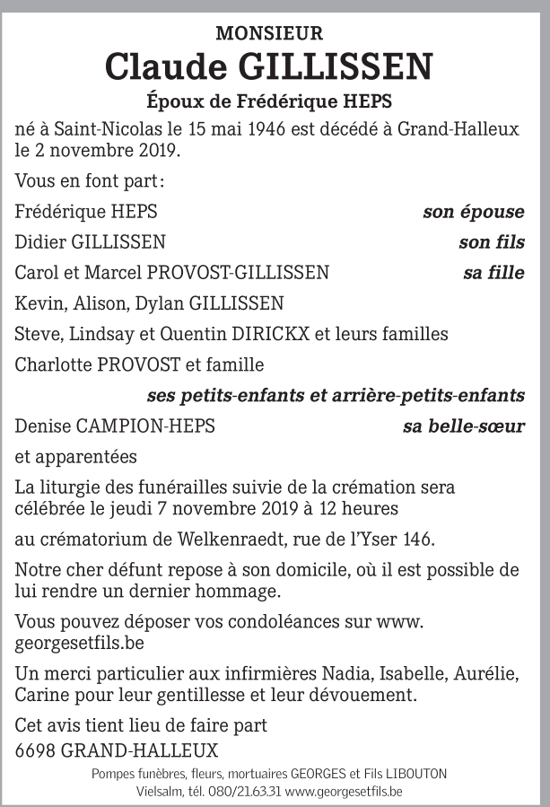 Décédé à Grand-Halleux (6698) le samedi 2 novembre 2019 à l'âge de 73 ans