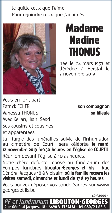 Décédée à Herstal (4040) le jeudi 7 novembre 2019 à l'âge de 66 ans