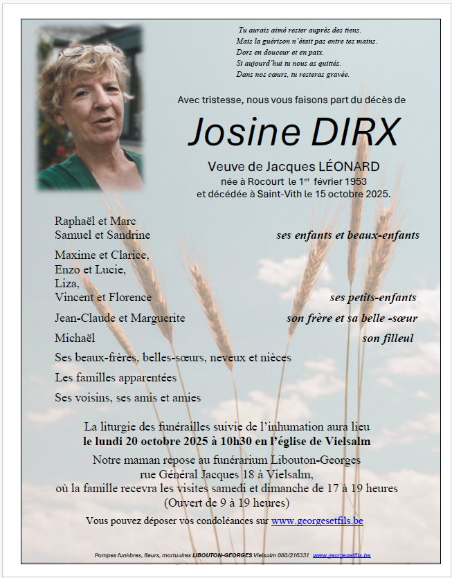 Décédée à Saint-Vith (4780) le mercredi 15 octobre 2025 à l'âge de 72 ans