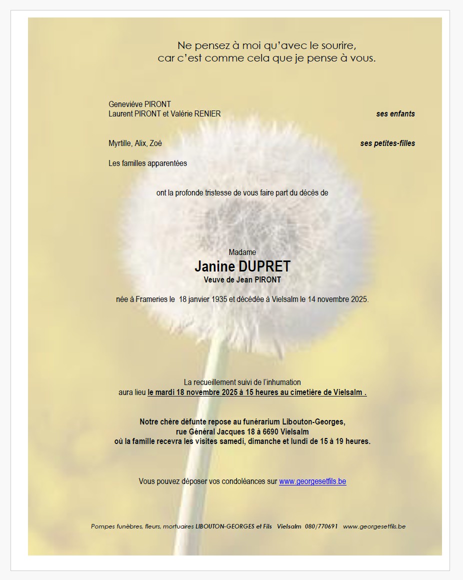 Décédée à Vielsalm (6690) le vendredi 14 novembre 2025 à l'âge de 90 ans
