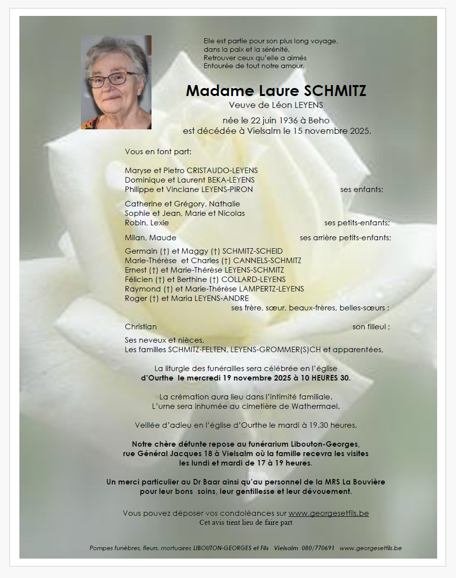 Décédée à Vielsalm (6690) le samedi 15 novembre 2025 à l'âge de 89 ans