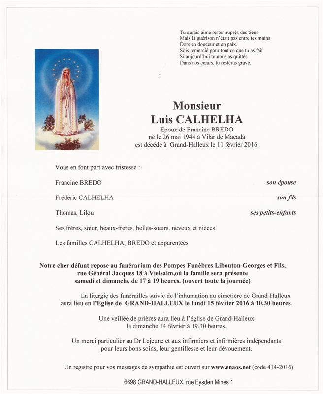 Décédé à Grand-Halleux (6698) le jeudi 11 février 2016 à l'âge de 71 ans