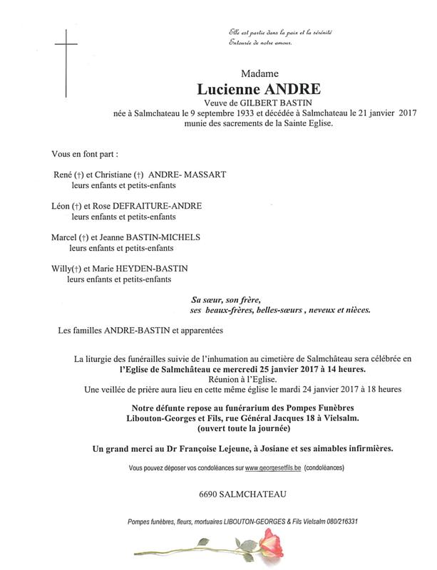 Madame Lucienne ANDRE veuve de Gilbert BASTIN