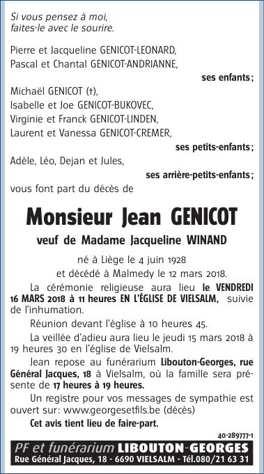 Décédé à Malmedy (4960) le lundi 12 mars 2018 à l'âge de 89 ans