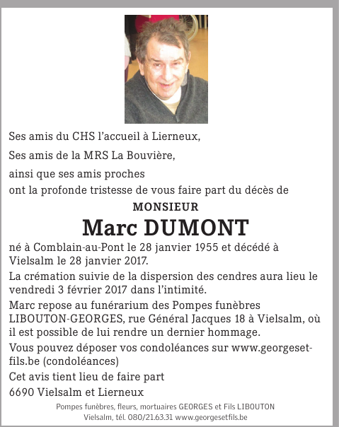 Décédé à Vielsalm (6690) le samedi 28 janvier 2017 à l'âge de 62 ans