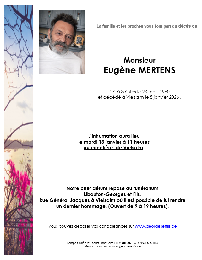 Décédé à Vielsalm (6690) le jeudi 8 janvier 2026 à l'âge de 65 ans