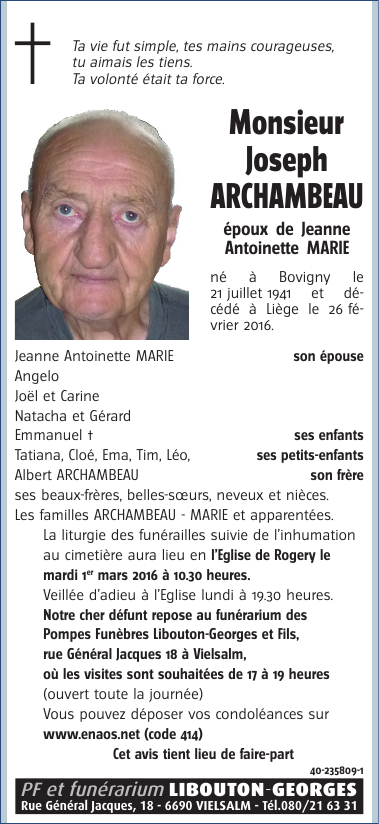 Décédé à Liège (4020) le vendredi 26 février 2016 à l'âge de 74 ans