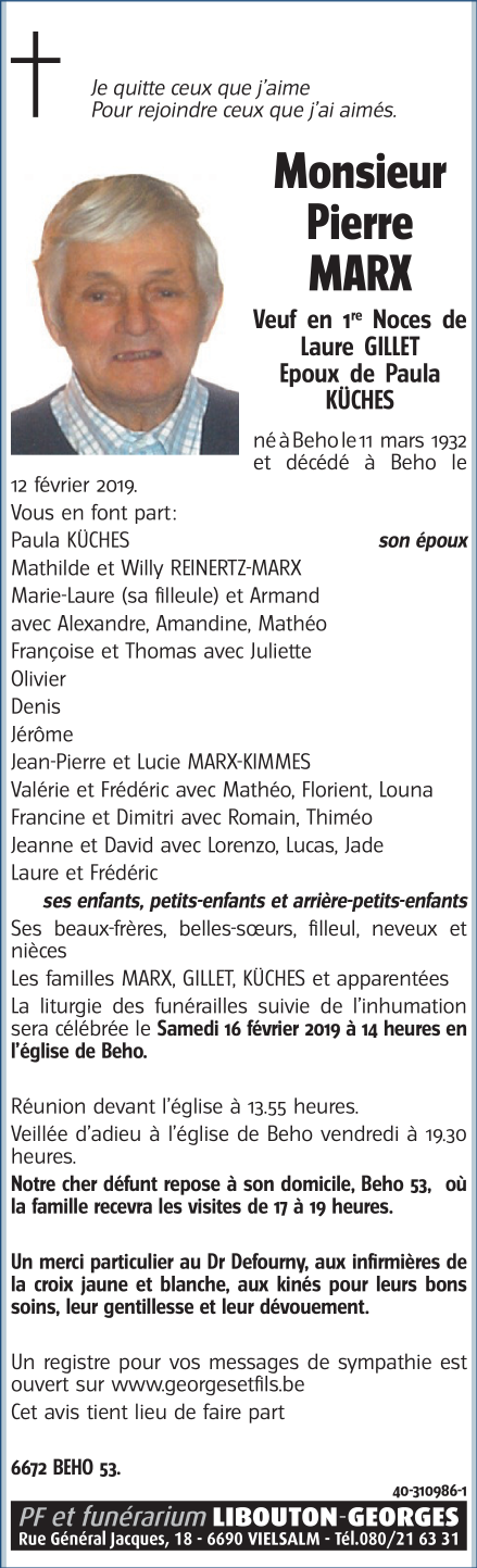 Décédé à Beho (6672) le mardi 12 février 2019 à l'âge de 86 ans