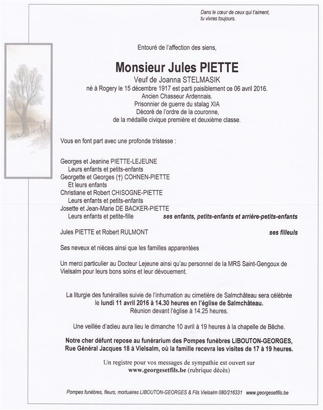 Décédé à Vielsalm (6690) le mercredi 6 avril 2016 à l'âge de 98 ans