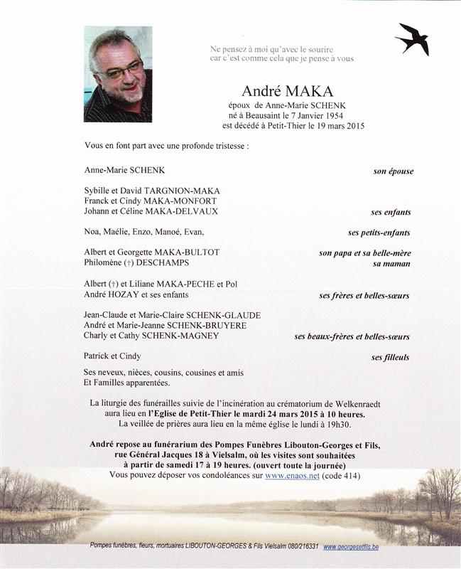 Décédé à Petit-Thier (6692) le jeudi 19 mars 2015 à l'âge de 61 ans