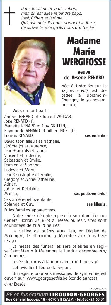 Décédée à Libramont-Chevigny (6800) le jeudi 30 novembre 2017 à l'âge de 90 ans