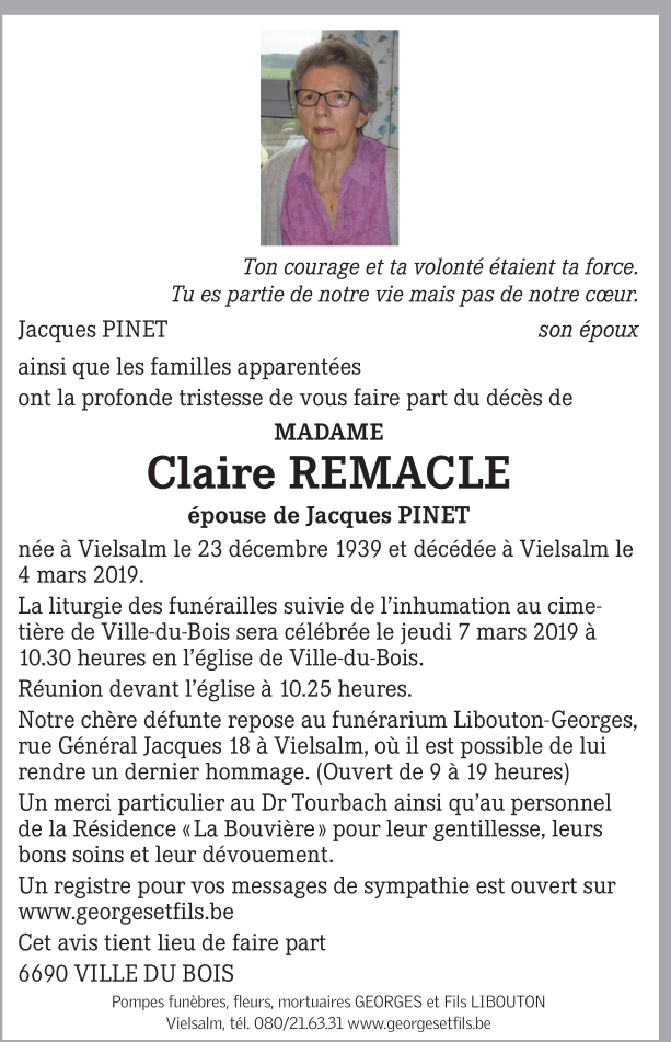 Décédée à Vielsalm (6690) le lundi 4 mars 2019 à l'âge de 79 ans