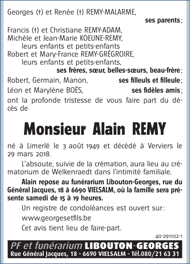 Décédé à Verviers (4800) le jeudi 29 mars 2018 à l'âge de 68 ans
