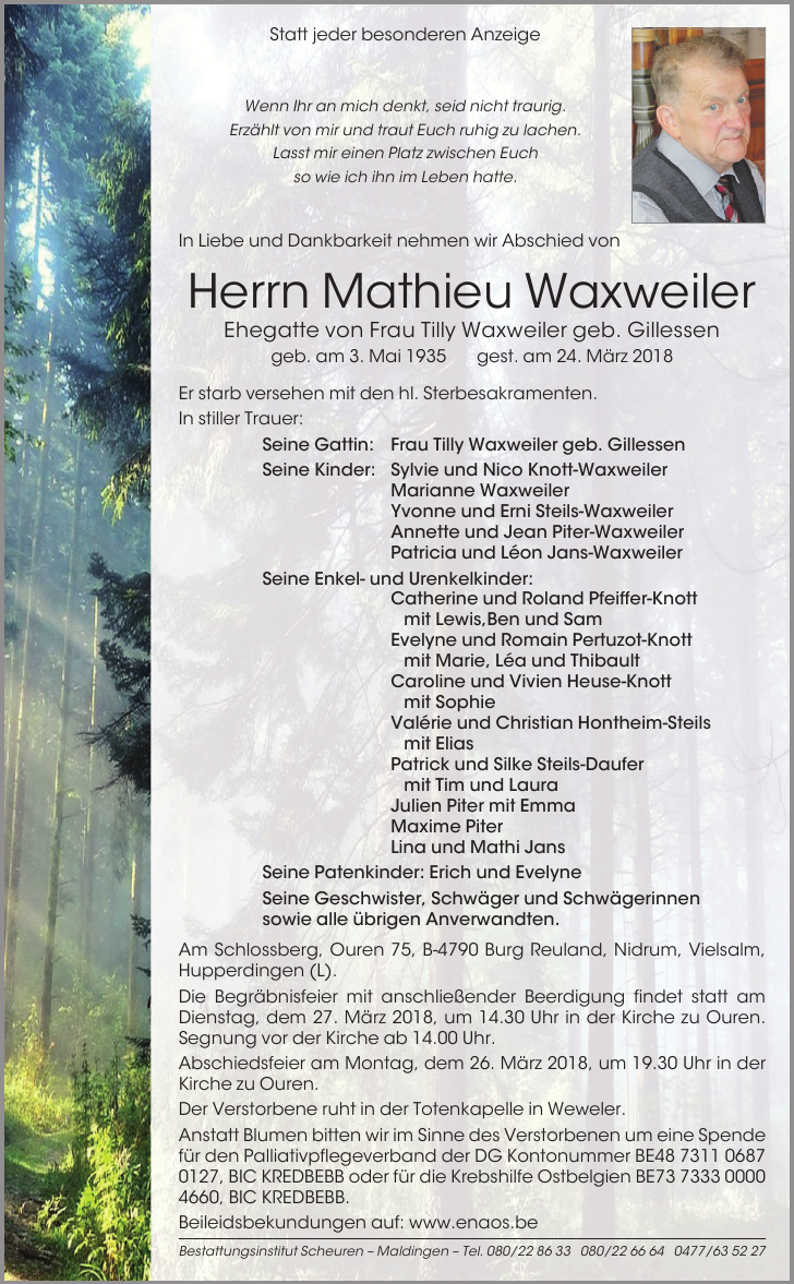 Décédé à Ouren (4790) le samedi 24 mars 2018 à l'âge de 82 ans