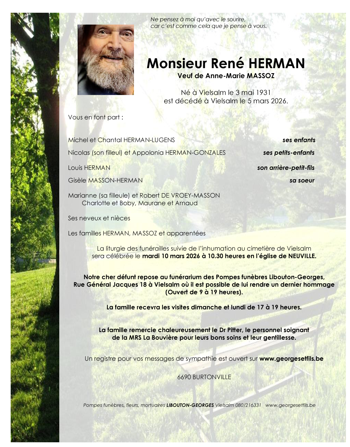 Décédé à Vielsalm (6690) le jeudi 5 mars 2026 à l'âge de 94 ans