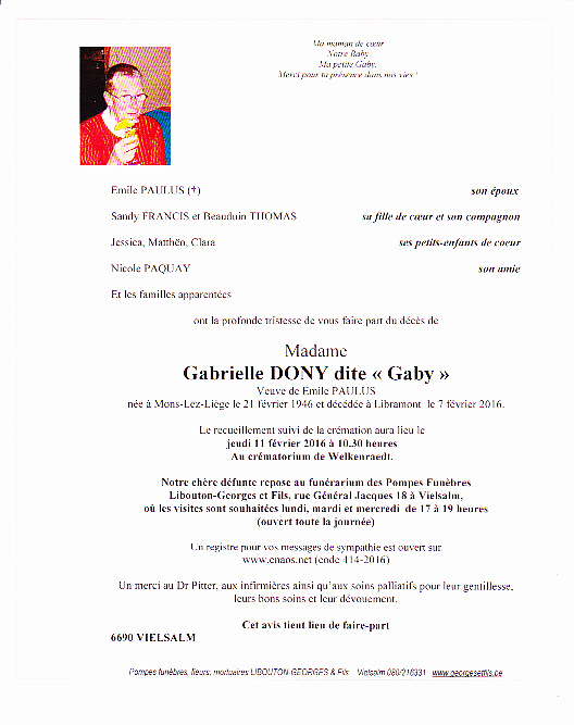 Décédée à Libramont-Chevigny (6800) le dimanche 7 février 2016 à l'âge de 69 ans