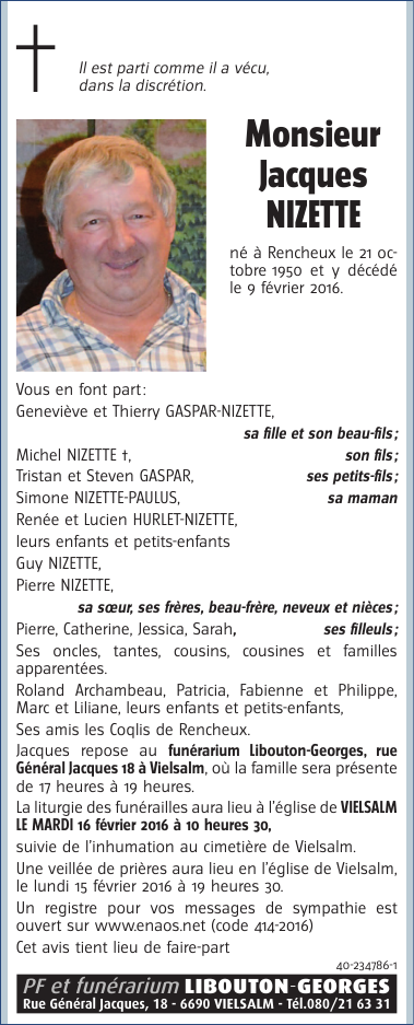 Décédé à Rencheux (6690) le mardi 9 février 2016 à l'âge de 65 ans