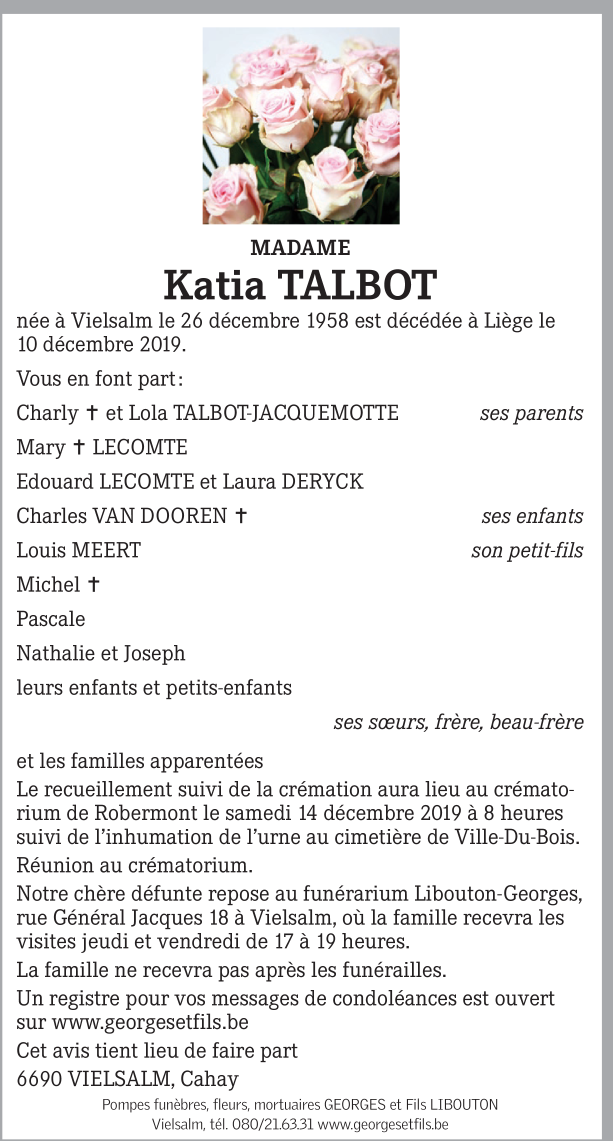 Décédée à Liège (4000) le mardi 10 décembre 2019 à l'âge de 60 ans