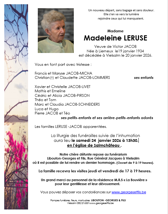 Décédée à Vielsalm (6690) le mardi 20 janvier 2026 à l'âge de 92 ans