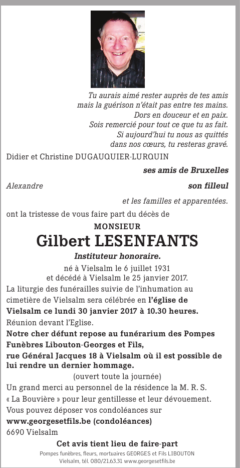 Décédé à Vielsalm (6690) le mercredi 25 janvier 2017 à l'âge de 85 ans