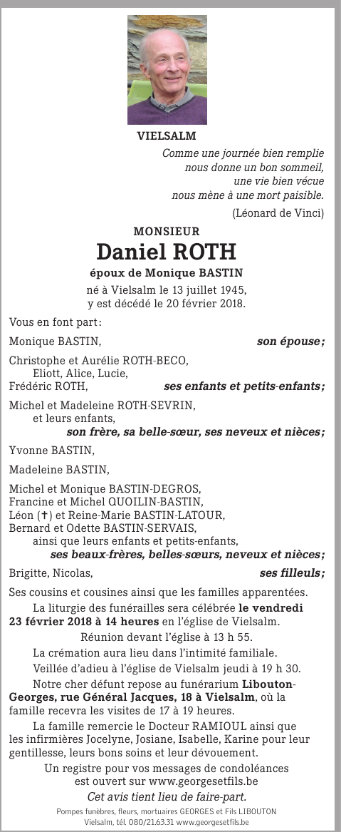 Décédé à Vielsalm (6690) le mardi 20 février 2018 à l'âge de 72 ans