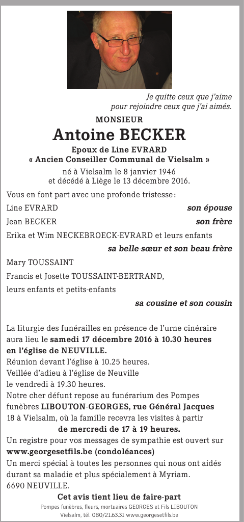 Décédé à Liège (4000) le mardi 13 décembre 2016 à l'âge de 70 ans