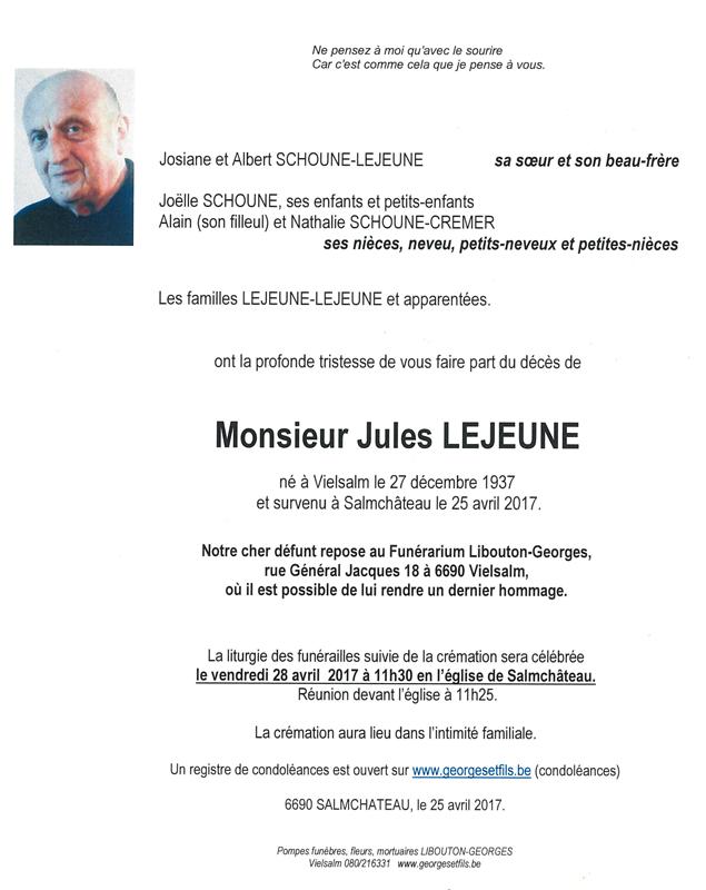 Décédé à Vielsalm (6690) le mardi 25 avril 2017 à l'âge de 79 ans