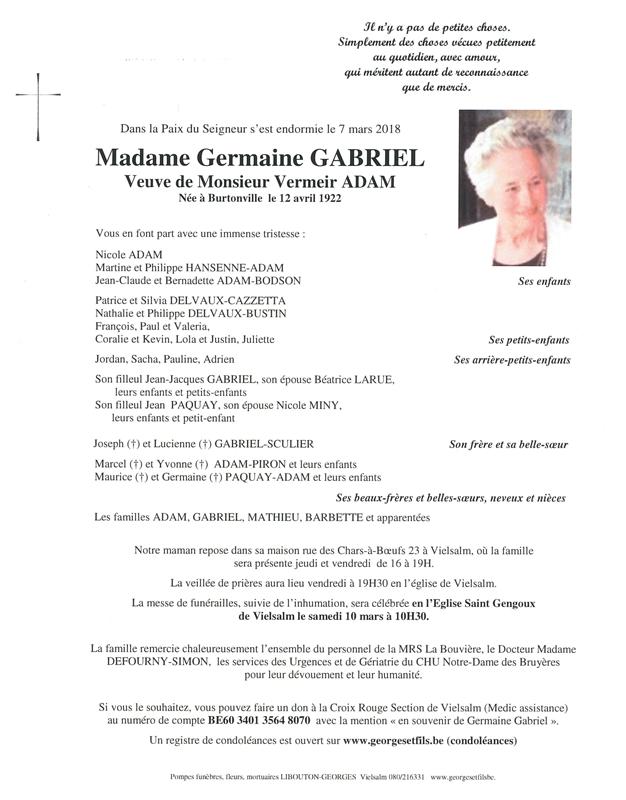 Madame Germaine GABRIEL veuve de Vermeir ADAM