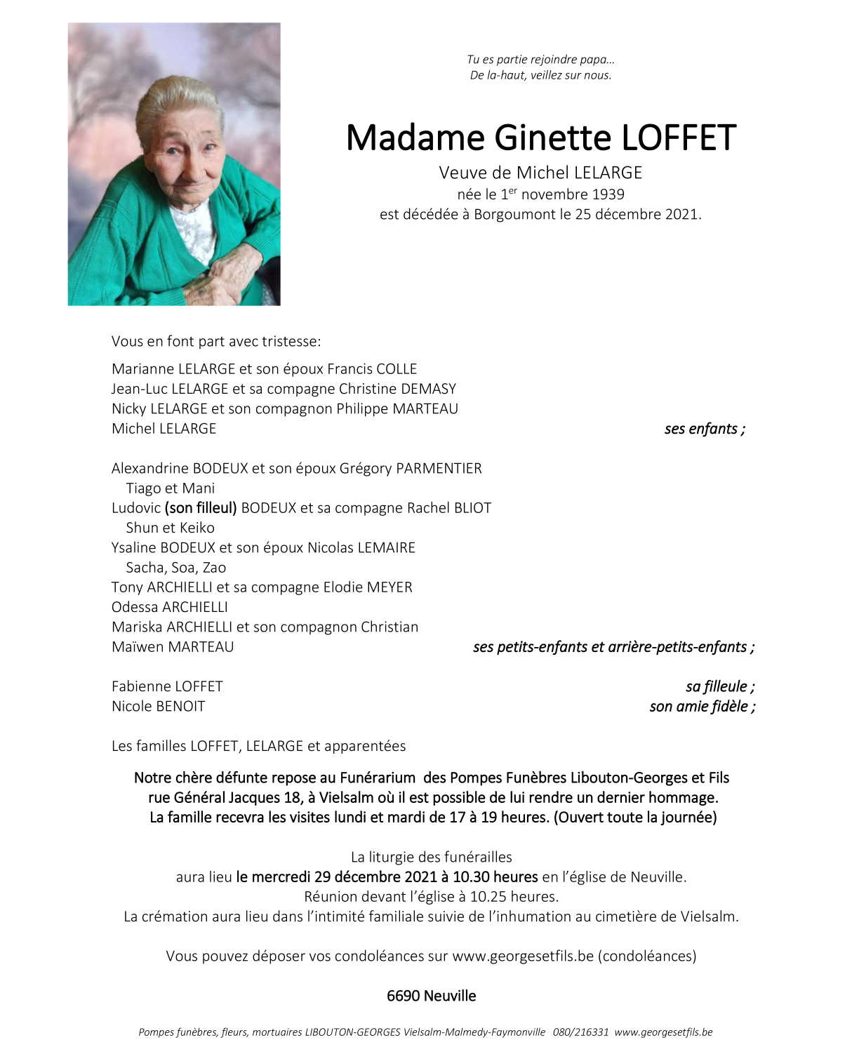 Décédée à La Gleize (4987) le samedi 25 décembre 2021 à l'âge de 82 ans